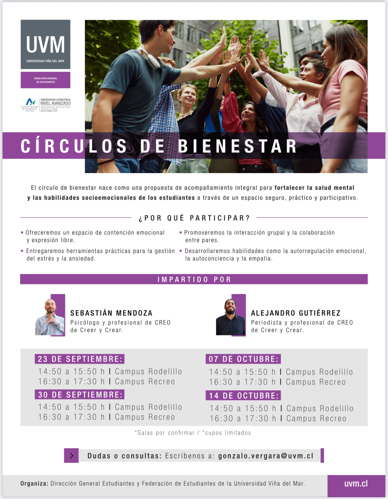 Este es el primer círculo de bienestar de cuatro que se llevarán a cabo en la UVM. El siguiente está programado para el 30 de septiembre a las 14.50 hrs en el Campus Rodelillo; el tercero será el 07 de octubre y el cuarto el 14 de octubre.